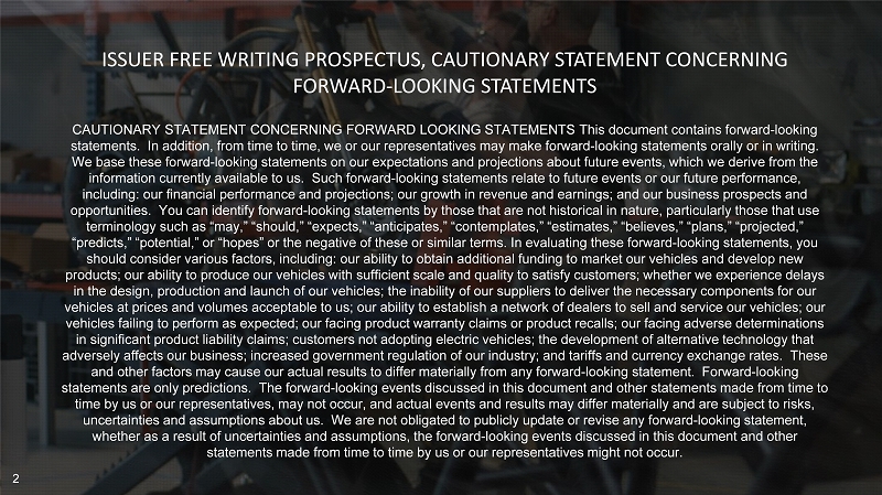 ISSUER FREE WRITING PROSPECTUS, CAUTIONARY STATEMENT CONCERNING FORWARD - LOOKING STATEMENTS CAUTIONARY STATEMENT CONCERNING FORWARD LOOKING STATEMENTS This document contains forward - looking statements. In addition, from time to time, we or our representatives may make forward - looking statements orally or in writing. We base these forward - looking statements on our expectations and projections about future events, which we derive from the information currently available to us. Such forward - looking statements relate to future events or our future performance, including: our financial performance and projections; our growth in revenue and earnings; and our business prospects and opportunities. You can identify forward - looking statements by those that are not historical in nature, particularly those that use terminology such as “may,” “should,” “expects,” “anticipates,” “contemplates,” “estimates,” “believes,” “plans,” “projected,” “predicts,” “potential,” or “hopes” or the negative of these or similar terms. In evaluating these forward - looking statements, y ou should consider various factors, including: our ability to obtain additional funding to market our vehicles and develop new products; our ability to produce our vehicles with sufficient scale and quality to satisfy customers; whether we experience d ela ys in the design, production and launch of our vehicles; the inability of our suppliers to deliver the necessary components for our vehicles at prices and volumes acceptable to us; our ability to establish a network of dealers to sell and service our vehicl es; our vehicles failing to perform as expected; our facing product warranty claims or product recalls; our facing adverse determinat ion s in significant product liability claims; customers not adopting electric vehicles; the development of alternative technology tha t adversely affects our business; increased government regulation of our industry; and tariffs and currency exchange rates. Th ese and other factors may cause our actual results to differ materially from any forward - looking statement. Forward - looking statements are only predictions. The forward - looking events discussed in this document and other statements made from time to time by us or our representatives, may not occur, and actual events and results may differ materially and are subject to risk s, uncertainties and assumptions about us. We are not obligated to publicly update or revise any forward - looking statement, whether as a result of uncertainties and assumptions, the forward - looking events discussed in this document and other statements made from time to time by us or our representatives might not occur. 2