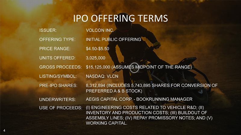 IPO OFFERING TERMS ISSUER: OFFERING TYPE: PRICE RANGE: UNITS OFFERED: GROSS PROCEEDS: LISTING/SYMBOL: PRE - IPO SHARES: 4 VOLCON INC. INITIAL PUBLIC OFFERING $4.50 - $5.50 3,025,000 $15,125,000 (ASSUMES MIDPOINT OF THE RANGE) NASDAQ: VLCN 8,312,894 (INCLUDES 5,743,895 SHARES FOR CONVERSION OF PREFERRED A & B STOCK) AEGIS CAPITAL CORP. - BOOKRUNNING MANAGER (I) ENGINEERING COSTS RELATED TO VEHICLE R&D; (II) INVENTORY AND PRODUCTION COSTS; (III) BUILDOUT OF ASSEMBLY LINES; (IV) REPAY PROMISSORY NOTES; AND (V) WORKING CAPITAL. UNDERWRITERS: USE OF PROCEEDS: