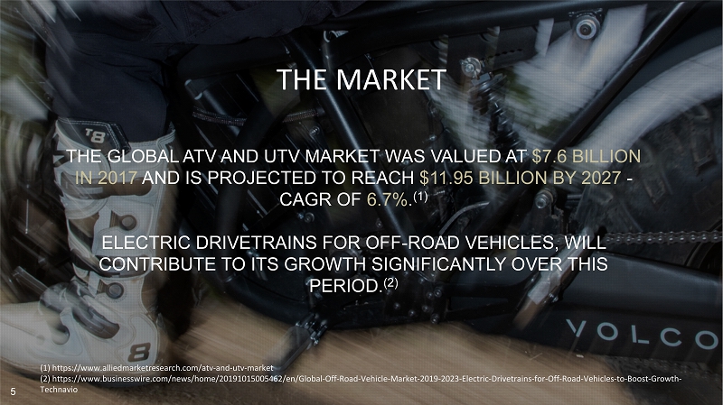 THE GLOBAL ATV AND UTV MARKET WAS VALUED AT $7.6 BILLION IN 2017 AND IS PROJECTED TO REACH $11.95 BILLION BY 2027 - CAGR OF 6.7% . (1) ELECTRIC DRIVETRAINS FOR OFF - ROAD VEHICLES, WILL CONTRIBUTE TO ITS GROWTH SIGNIFICANTLY OVER THIS PERIOD. (2) THE MARKET 5 (1) https://www.alliedmarketresearch.com/atv - and - utv - market (2) https://www.businesswire.com/news/home/20191015005462/en/Global - Off - Road - Vehicle - Market - 2019 - 2023 - Electric - Drivetrains - for - O ff - Road - Vehicles - to - Boost - Growth - Technavio