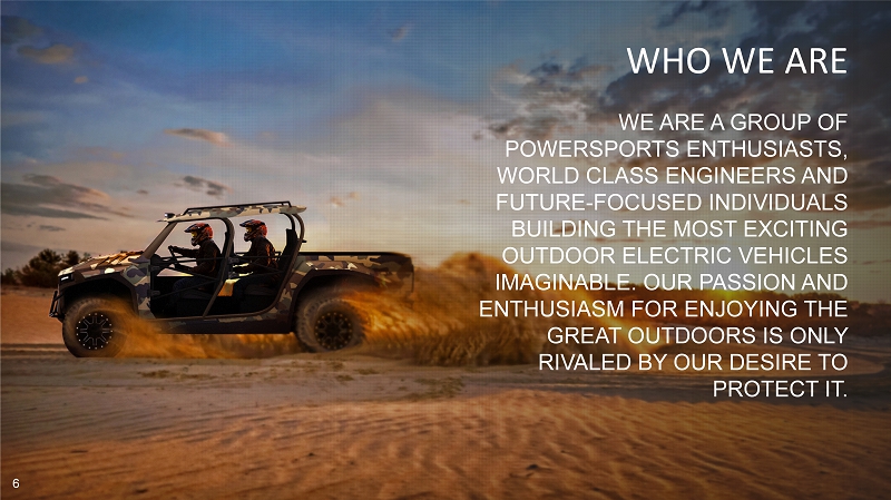 WHO WE ARE WE ARE A GROUP OF POWERSPORTS ENTHUSIASTS, WORLD CLASS ENGINEERS AND FUTURE - FOCUSED INDIVIDUALS BUILDING THE MOST EXCITING OUTDOOR ELECTRIC VEHICLES IMAGINABLE. OUR PASSION AND ENTHUSIASM FOR ENJOYING THE GREAT OUTDOORS IS ONLY RIVALED BY OUR DESIRE TO PROTECT IT. 6