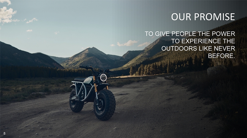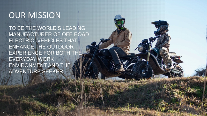 7 TO BE THE WORLD’S LEADING MANUFACTURER OF OFF - ROAD ELECTRIC VEHICLES THAT ENHANCE THE OUTDOOR EXPERIENCE FOR BOTH THE EVERYDAY WORK ENVIRONMENT AND THE ADVENTURE SEEKER. 7 OUR MISSION