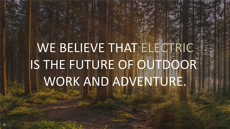 WE BELIEVE THAT ELECTRIC IS THE FUTURE OF OUTDOOR WORK AND ADVENTURE. 9