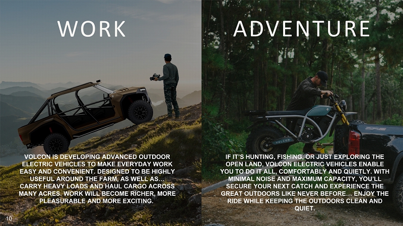 WORK ADVENTURE VOLCON IS DEVELOPING ADVANCED OUTDOOR ELECTRIC VEHICLES TO MAKE EVERYDAY WORK EASY AND CONVENIENT. DESIGNED TO BE HIGHLY USEFUL AROUND THE FARM, AS WELL AS… CARRY HEAVY LOADS AND HAUL CARGO ACROSS MANY ACRES. WORK WILL BECOME RICHER, MORE PLEASURABLE AND MORE EXCITING. IF IT’S HUNTING, FISHING, OR JUST EXPLORING THE OPEN LAND, VOLCON ELECTRIC VEHICLES ENABLE YOU TO DO IT ALL, COMFORTABLY AND QUIETLY. WITH MINIMAL NOISE AND MAXIMUM CAPACITY, YOU’LL SECURE YOUR NEXT CATCH AND EXPERIENCE THE GREAT OUTDOORS LIKE NEVER BEFORE… ENJOY THE RIDE WHILE KEEPING THE OUTDOORS CLEAN AND QUIET. 10