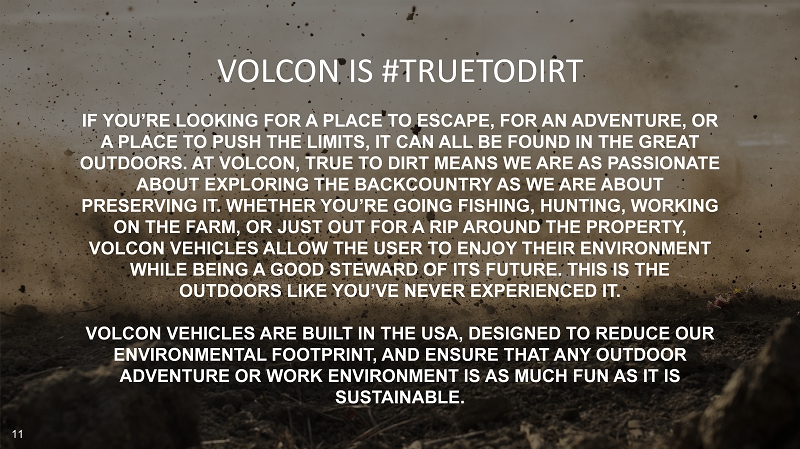 IF YOU’RE LOOKING FOR A PLACE TO ESCAPE, FOR AN ADVENTURE, OR A PLACE TO PUSH THE LIMITS, IT CAN ALL BE FOUND IN THE GREAT OUTDOORS. AT VOLCON, TRUE TO DIRT MEANS WE ARE AS PASSIONATE ABOUT EXPLORING THE BACKCOUNTRY AS WE ARE ABOUT PRESERVING IT. WHETHER YOU’RE GOING FISHING, HUNTING, WORKING ON THE FARM, OR JUST OUT FOR A RIP AROUND THE PROPERTY, VOLCON VEHICLES ALLOW THE USER TO ENJOY THEIR ENVIRONMENT WHILE BEING A GOOD STEWARD OF ITS FUTURE. THIS IS THE OUTDOORS LIKE YOU’VE NEVER EXPERIENCED IT. VOLCON VEHICLES ARE BUILT IN THE USA, DESIGNED TO REDUCE OUR ENVIRONMENTAL FOOTPRINT, AND ENSURE THAT ANY OUTDOOR ADVENTURE OR WORK ENVIRONMENT IS AS MUCH FUN AS IT IS SUSTAINABLE. VOLCON IS #TRUETODIRT 11