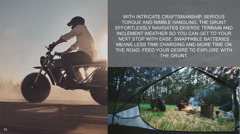 WITH INTRICATE CRAFTSMANSHIP, SERIOUS TORQUE AND NIMBLE HANDLING, THE GRUNT EFFORTLESSLY NAVIGATES DIVERSE TERRAIN AND INCLEMENT WEATHER SO YOU CAN GET TO YOUR NEXT STOP WITH EASE. SWAPPABLE BATTERIES MEANS LESS TIME CHARGING AND MORE TIME ON THE ROAD. FEED YOUR DESIRE TO EXPLORE WITH THE GRUNT. 15 15