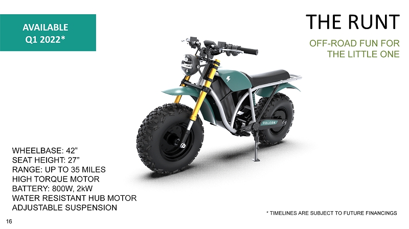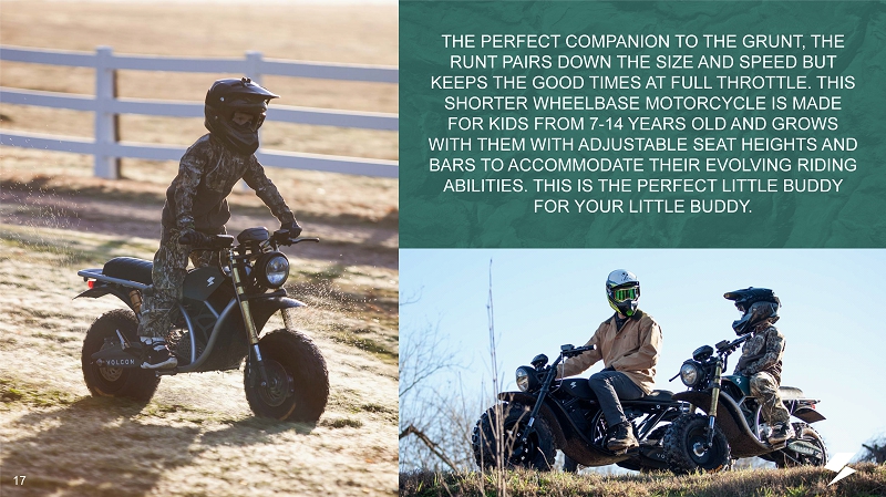 OFF - ROAD FUN FOR THE LITTLE ONE THE RUNT WHEELBASE: 42” SEAT HEIGHT: 27” RANGE: UP TO 35 MILES HIGH TORQUE MOTOR BATTERY: 800W, 2kW WATER RESISTANT HUB MOTOR ADJUSTABLE SUSPENSION AVAILABLE Q1 2022* * TIMELINES ARE SUBJECT TO FUTURE FINANCINGS 16