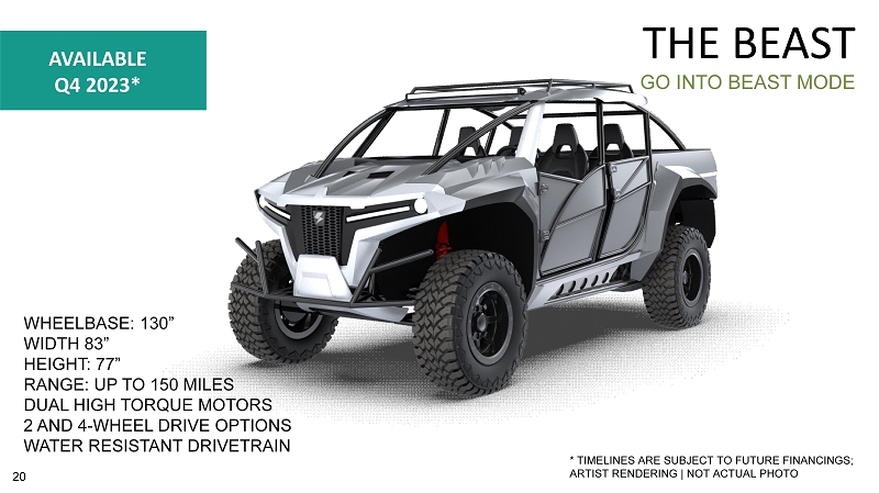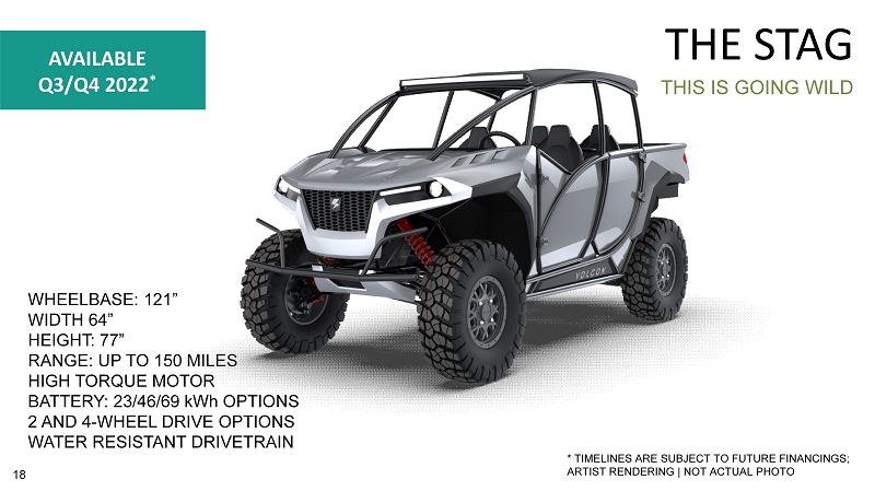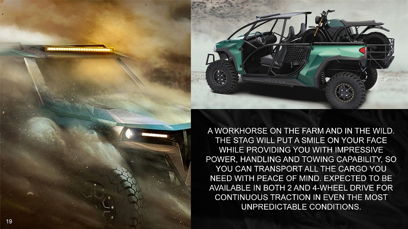 THIS IS GOING WILD THE STAG WHEELBASE: 121” WIDTH 64” HEIGHT: 77” RANGE: UP TO 150 MILES HIGH TORQUE MOTOR BATTERY: 23/46/69 kWh OPTIONS 2 AND 4 - WHEEL DRIVE OPTIONS WATER RESISTANT DRIVETRAIN AVAILABLE Q3/Q4 2022 * * TIMELINES ARE SUBJECT TO FUTURE FINANCINGS; ARTIST RENDERING | NOT ACTUAL PHOTO 18
