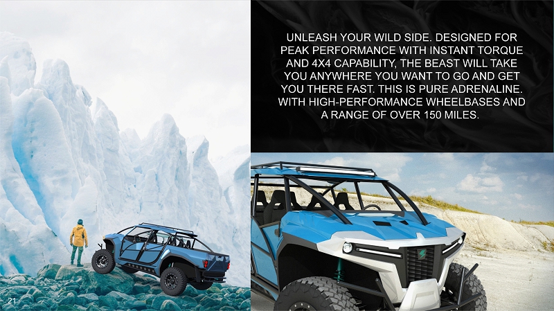 GO INTO BEAST MODE THE BEAST WHEELBASE: 130” WIDTH 83” HEIGHT: 77” RANGE: UP TO 150 MILES DUAL HIGH TORQUE MOTORS 2 AND 4 - WHEEL DRIVE OPTIONS WATER RESISTANT DRIVETRAIN AVAILABLE Q4 2023* 20 * TIMELINES ARE SUBJECT TO FUTURE FINANCINGS; ARTIST RENDERING | NOT ACTUAL PHOTO