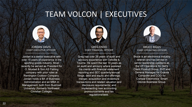 22 TEAM VOLCON | EXECUTIVES 22 JORDAN DAVIS CHIEF EXECUTIVE OFFICER Jordan is a senior executive with over 15 years of experience in the sporting goods industry. Most recently he served as President for O. Mustad & Son AS Fishing company with prior roles at Remington Outdoor Company. Jordan holds a BA of Business Administration and an MBA in Management, both from Bushnell University (formerly Northwest Christian College). GREG ENDO CHIEF FINANCIAL OFFICER Greg has over 26 years of audit and advisory experience with Deloitte & Touche . He spent the last 14 years as an audit and advisory where assisted his clients with financial statement reporting and SEC quarterly/annual filings; debt and equity and offerings; merger, acquisition and divestiture transactions and related valuation and disclosure requirements; and implementing new accounting pronouncements and tax regulations/laws. BRUCE RIGGS CHIEF OPERATING OFFICER Bruce is an electronics industry veteran and has served in senior leadership positions as the VP Operations for Dell's Client Product Group, SVP and General Manager for Quanta Computer and COO for Compal Electronics' Smart Device Business Group.