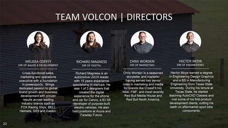 23 23 MELISSA COFFEY DIR OF SALES & DEVELOPMENT Cross - functional sales, marketing and operations executive with a foundation in powersports. Brings dedicated passion to global brand growth and business development with proven results across leading industry brands such as FOX Racing Shox , BELL Helmets, SIDI and Easton. TEAM VOLCON | DIRECTORS RICHARD MAGNESS DIR OF DIGITAL Richard Magness is an automotive UI/UX leader with 15 years experience specializing in startups. He was 1 of 3 designers that created the digital experience for the phone and car for Canoo , a $3.5B developer of purpose - built electric vehicles. He also held positions at Acura and Faraday Future. CHRIS WORDEN DIR OF MARKETING Chris Worden is a seasoned storyteller and marketer having served key senior roles in marketing and media for brands like CrossFit Inc, Nike, FMF, and most recently Red Bull Media House and Red Bull North America. HECTOR MOYA DIR OF ENGINEERING Hector Moya earned a degree in Engineering Design Graphics and a BS in Manufacturing Engineering from Texas State University. During his tenure at Texas State, he started teaching AutoCAD Classes and met some of his first product development clients, cutting his teeth on aftermarket sport bike components.