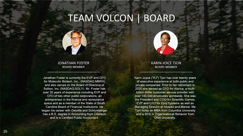25 25 TEAM VOLCON | BOARD KARIN - JOICE TJON BOARD MEMBER Karin - Joyce ("KJ") Tjon has over twenty years of executive experience at both public and private companies. Prior to her retirement in 2020 she served as CFO for Alorica, a multi - billion dollar customer service provider with over 100,000 employees worldwide. She was the President and COO for Scientific Games, EVP and CFO for Epiq Systems as well as Managing Director at Alvarez and Marsal. Ms Tjon holds an MBA from Columbia University and a BSS in Organizational Behavior from Ohio University. JONATHAN FOSTER BOARD MEMBER Jonathan Foster is currently the EVP and CFO for Moleculin Biotech, Inc., (NASDAQ:MBRX) and also serves on the Board of Directors of Soliton, Inc. (NASDAQ:SOLY). Mr. Foster has over 30 years of experience including EVP and CFO of two other public corporations, an entrepreneur in the finance and reinsurance space and as a member of the State of South Carolina Board of Financial Institutions. He began his career with Deloitte and Schlumberger has a B.S. degree in Accounting from Clemson and is a Certified Public Accountant.