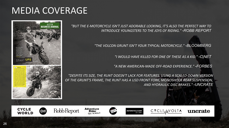"BUT THE E - MOTORCYCLE ISN'T JUST ADORABLE LOOKING, IT'S ALSO THE PERFECT WAY TO INTRODUCE YOUNGSTERS TO THE JOYS OF RIDING." - ROBB REPORT "I WOULD HAVE KILLED FOR ONE OF THESE AS A KID." - C|NET "A NEW AMERICAN - MADE OFF - ROAD EXPERIENCE." - FORBES "DESPITE ITS SIZE, THE RUNT DOESN'T LACK FOR FEATURES. USING A SCALED - DOWN VERSION OF THE GRUNT'S FRAME, THE RUNT HAS A USD FRONT FORK, MONOSHOCK REAR SUSPENSION, AND HYDRAULIC DISC BRAKES." - UNCRATE 26 MEDIA COVERAGE "THE VOLCON GRUNT ISN’T YOUR TYPICAL MOTORCYCLE." - BLOOMBERG
