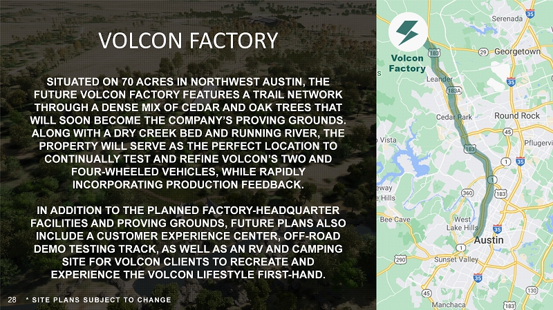 VOLCON FACTORY SITUATED ON 70 ACRES IN NORTHWEST AUSTIN, THE FUTURE VOLCON FACTORY FEATURES A TRAIL NETWORK THROUGH A DENSE MIX OF CEDAR AND OAK TREES THAT WILL SOON BECOME THE COMPANY’S PROVING GROUNDS. ALONG WITH A DRY CREEK BED AND RUNNING RIVER, THE PROPERTY WILL SERVE AS THE PERFECT LOCATION TO CONTINUALLY TEST AND REFINE VOLCON’S TWO AND FOUR - WHEELED VEHICLES, WHILE RAPIDLY INCORPORATING PRODUCTION FEEDBACK. IN ADDITION TO THE PLANNED FACTORY - HEADQUARTER FACILITIES AND PROVING GROUNDS, FUTURE PLANS ALSO INCLUDE A CUSTOMER EXPERIENCE CENTER, OFF - ROAD DEMO TESTING TRACK, AS WELL AS AN RV AND CAMPING SITE FOR VOLCON CLIENTS TO RECREATE AND EXPERIENCE THE VOLCON LIFESTYLE FIRST - HAND. 28 * SITE PLANS SUBJECT TO CHANGE