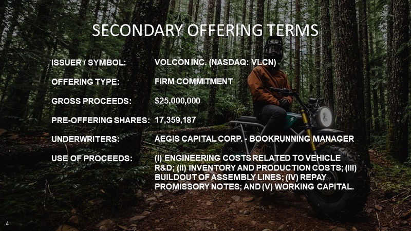 SECONDARY OFFERING TERMS 4 VOLCON INC. (NASDAQ: VLCN) FIRM COMMITMENT $25,000,000 17,359,187 AEGIS CAPITAL CORP. - BOOKRUNNING MANAGER (I) ENGINEERING COSTS RELATED TO VEHICLE R&D; (II) INVENTORY AND PRODUCTION COSTS; (III) BUILDOUT OF ASSEMBLY LINES; (IV) REPAY PROMISSORY NOTES; AND (V) WORKING CAPITAL. ISSUER / SYMBOL: OFFERING TYPE: GROSS PROCEEDS: PRE - OFFERING SHARES: UNDERWRITERS: USE OF PROCEEDS: