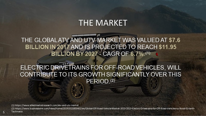 5 THE GLOBAL ATV AND UTV MARKET WAS VALUED AT $7.6 BILLION IN 2017 AND IS PROJECTED TO REACH $11.95 BILLION BY 2027 - CAGR OF 6.7% . (1) ELECTRIC DRIVETRAINS FOR OFF - ROAD VEHICLES, WILL CONTRIBUTE TO ITS GROWTH SIGNIFICANTLY OVER THIS PERIOD. (2) THE MARKET (1) https://www.alliedmarketresearch.com/atv - and - utv - market (2) https://www.businesswire.com/news/home/20191015005462/en/Global - Off - Road - Vehicle - Market - 2019 - 2023 - Electric - Drivetrains - for - O ff - Road - Vehicles - to - Boost - Growth - Technavio