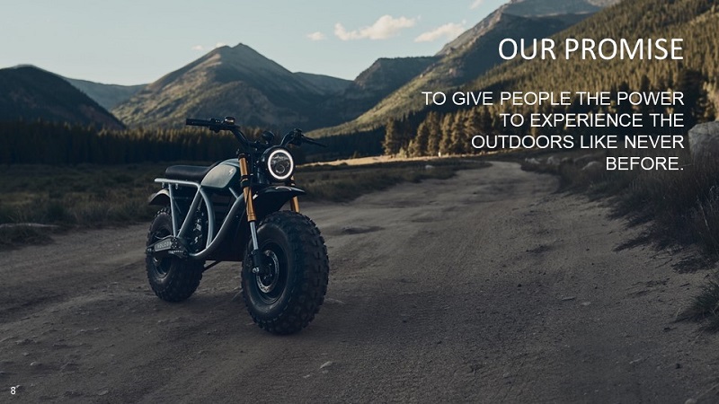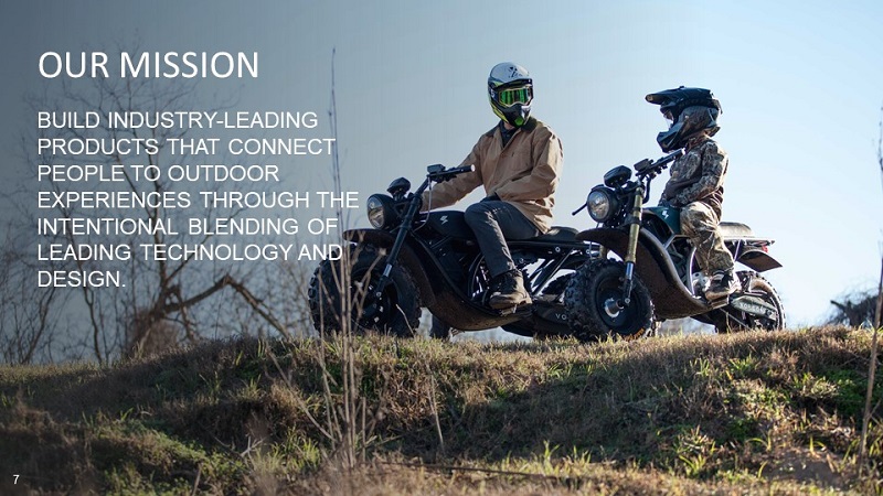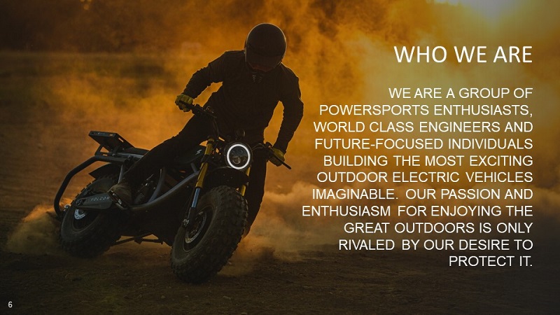 WHO WE ARE WE ARE A GROUP OF POWERSPORTS ENTHUSIASTS, WORLD CLASS ENGINEERS AND FUTURE - FOCUSED INDIVIDUALS BUILDING THE MOST EXCITING OUTDOOR ELECTRIC VEHICLES IMAGINABLE. OUR PASSION AND ENTHUSIASM FOR ENJOYING THE GREAT OUTDOORS IS ONLY RIVALED BY OUR DESIRE TO PROTECT IT. 6
