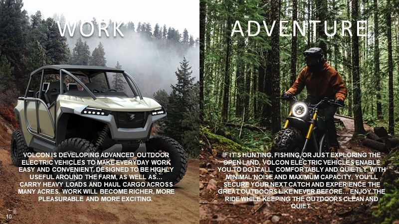 WORK ADVENTURE VOLCON IS DEVELOPING ADVANCED OUTDOOR ELECTRIC VEHICLES TO MAKE EVERYDAY WORK EASY AND CONVENIENT. DESIGNED TO BE HIGHLY USEFUL AROUND THE FARM, AS WELL AS… CARRY HEAVY LOADS AND HAUL CARGO ACROSS MANY ACRES. WORK WILL BECOME RICHER, MORE PLEASURABLE AND MORE EXCITING. IF IT’S HUNTING, FISHING, OR JUST EXPLORING THE OPEN LAND, VOLCON ELECTRIC VEHICLES ENABLE YOU TO DO IT ALL, COMFORTABLY AND QUIETLY. WITH MINIMAL NOISE AND MAXIMUM CAPACITY, YOU’LL SECURE YOUR NEXT CATCH AND EXPERIENCE THE GREAT OUTDOORS LIKE NEVER BEFORE… ENJOY THE RIDE WHILE KEEPING THE OUTDOORS CLEAN AND QUIET. 10