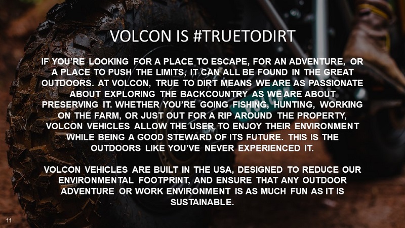 IF YOU’RE LOOKING FOR A PLACE TO ESCAPE, FOR AN ADVENTURE, OR A PLACE TO PUSH THE LIMITS, IT CAN ALL BE FOUND IN THE GREAT OUTDOORS. AT VOLCON, TRUE TO DIRT MEANS WE ARE AS PASSIONATE ABOUT EXPLORING THE BACKCOUNTRY AS WE ARE ABOUT PRESERVING IT. WHETHER YOU’RE GOING FISHING, HUNTING, WORKING ON THE FARM, OR JUST OUT FOR A RIP AROUND THE PROPERTY, VOLCON VEHICLES ALLOW THE USER TO ENJOY THEIR ENVIRONMENT WHILE BEING A GOOD STEWARD OF ITS FUTURE. THIS IS THE OUTDOORS LIKE YOU’VE NEVER EXPERIENCED IT. VOLCON VEHICLES ARE BUILT IN THE USA, DESIGNED TO REDUCE OUR ENVIRONMENTAL FOOTPRINT, AND ENSURE THAT ANY OUTDOOR ADVENTURE OR WORK ENVIRONMENT IS AS MUCH FUN AS IT IS SUSTAINABLE. VOLCON IS #TRUETODIRT 11