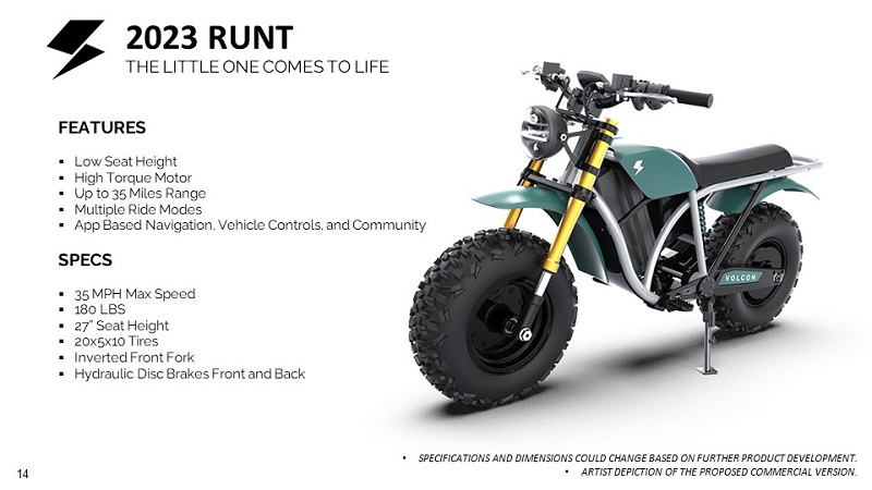 ’23 GRUNT LE + XL (HUNT/FISH) ’23 STAG TRAIL LE & BASE ’23 RUNT + ’23 GRUNT EVO 2022 - 2023 VLCN PRODUCT ROADMAP ’24 STAG ARMAGEDDON * SPECIFICATIONS AND DIMENSIONS COULD CHANGE BASED ON FURTHER PRODUCT DEVELOPMENT. TIMELINES ARE SUBJECT TO FUTURE FINANCINGS . ‘25 “ PROJECT X ” & ’24 RANCH ’24 STAG “HUNT” 13 ’23 BRAT