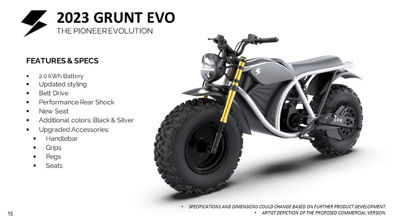 2023 GRUNT EVO FEATURES & SPECS ▪ 2.0 kWh Battery ▪ Updated styling ▪ Belt Drive ▪ Performance Rear Shock ▪ New Seat ▪ Additional colors : Black & Silver ▪ Upgraded Accessories: ▪ Handlebar ▪ Grips ▪ Pegs ▪ Seats THE PIONEER EVOLUTION 15 • SPECIFICATIONS AND DIMENSIONS COULD CHANGE BASED ON FURTHER PRODUCT DEVELOPMENT. • ARTIST DEPICTION OF THE PROPOSED COMMERCIAL VERSION.