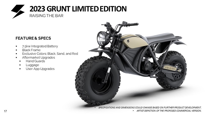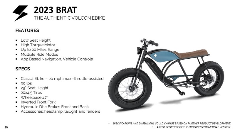 FEATURE S ▪ Low Seat Height ▪ High Torque Motor ▪ Up to 20 Miles Range ▪ Multiple Ride Modes ▪ App Based Navigation, Vehicle Controls SPECS ▪ Class 2 Ebike – 20 mph max – throttle - assisted ▪ 90 lbs ▪ 29” Seat Height ▪ 20x4.5 Tires ▪ Wheelbase 47” ▪ Inverted Front Fork ▪ Hydraulic Disc Brakes Front and Back ▪ Accessories: headlamp, taillight and fenders 2023 BRAT THE AUTHENTIC VOLCON EBIKE 16 • SPECIFICATIONS AND DIMENSIONS COULD CHANGE BASED ON FURTHER PRODUCT DEVELOPMENT. • ARTIST DEPICTION OF THE PROPOSED COMMERCIAL VERSION.
