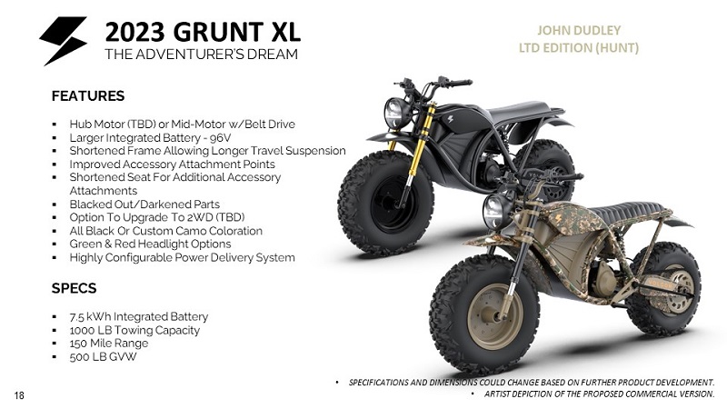 2023 GRUNT LIMITED EDITION FEATURE & SPECS ▪ 7.5kw Integrated Battery ▪ Black Frame ▪ Exclusive Colors ; Black , Sand , and Red ▪ Aftermarket Upgrades ▪ Hand Guards ▪ Luggage ▪ User App Upgrades RAISING THE BAR 17 • SPECIFICATIONS AND DIMENSIONS COULD CHANGE BASED ON FURTHER PRODUCT DEVELOPMENT. • ARTIST DEPICTION OF THE PROPOSED COMMERCIAL VERSION.