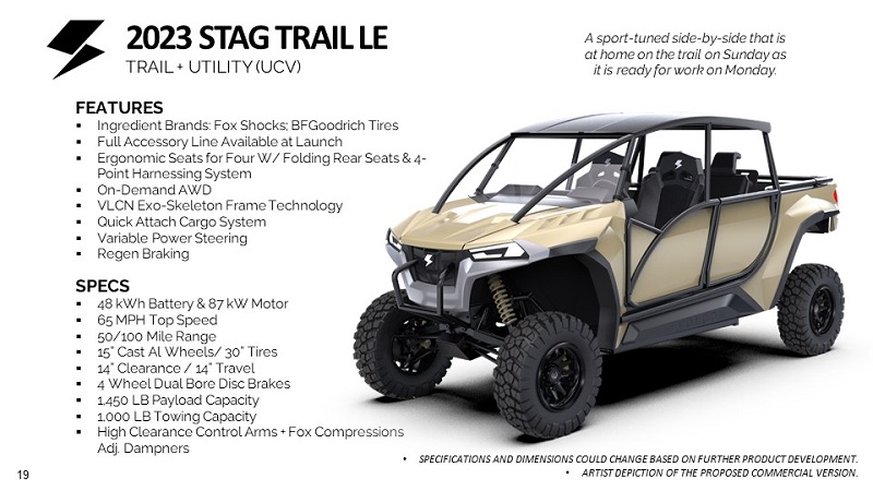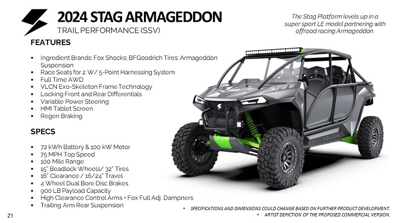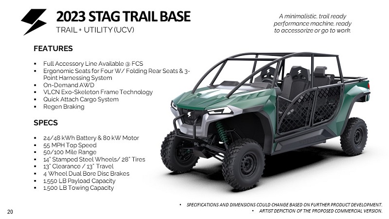 2023 STAG TRAIL BASE FEATURES ▪ Full Accessory Line Available @ FCS ▪ Ergonomic Seats for Four W/ Folding Rear Seats & 3 - Point Harnessing System ▪ On - Demand AWD ▪ VLCN Exo - Skeleton Frame Technology ▪ Quick Attach Cargo System ▪ Regen Braking SPECS ▪ 24/48 kWh Battery & 80 kW Motor ▪ 55 MPH Top Speed ▪ 50/100 Mile Range ▪ 14” Stamped Steel Wheels/ 28” Tires ▪ 13” Clearance / 13” Travel ▪ 4 Wheel Dual Bore Disc Brakes ▪ 1,550 LB Payload Capacity ▪ 1,500 LB Towing Capacity A minimalistic , trail ready performance machine, ready to accessorize or go to work. TRAIL + UTILITY (UCV) 20 • SPECIFICATIONS AND DIMENSIONS COULD CHANGE BASED ON FURTHER PRODUCT DEVELOPMENT. • ARTIST DEPICTION OF THE PROPOSED COMMERCIAL VERSION.