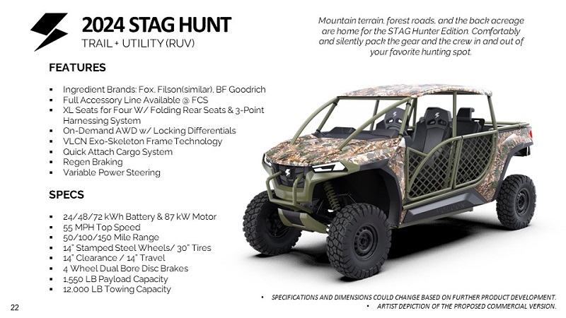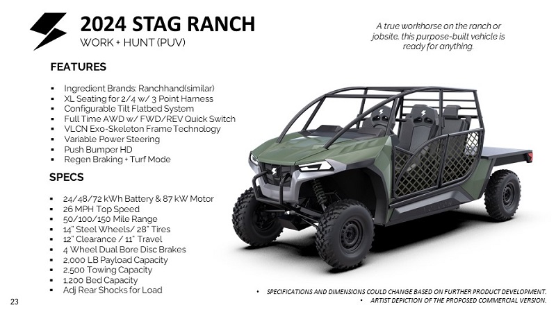 2024 STAG HUNT FEATURES ▪ Ingredient Brands: Fox, Filson (similar), BF Goodrich ▪ Full Accessory Line Available @ FCS ▪ XL Seats for Four W/ Folding Rear Seats & 3 - Point Harnessing System ▪ On - Demand AWD w/ Locking Differentials ▪ VLCN Exo - Skeleton Frame Technology ▪ Quick Attach Cargo System ▪ Regen Braking ▪ Variable Power Steering SPECS ▪ 24/48/72 kWh Battery & 87 kW Motor ▪ 55 MPH Top Speed ▪ 50/100/150 Mile Range ▪ 14” Stamped Steel Wheels/ 30” Tires ▪ 14” Clearance / 14” Travel ▪ 4 Wheel Dual Bore Disc Brakes ▪ 1,550 LB Payload Capacity ▪ 12,000 LB Towing Capacity Mountain terrain, forest roads , and the back acreage are home for the STAG Hunter Edition. Comfortably and silently p ack the gear and the crew in and out of your favorite hunting spot . TRAIL + UTILITY (RUV) 22 • SPECIFICATIONS AND DIMENSIONS COULD CHANGE BASED ON FURTHER PRODUCT DEVELOPMENT. • ARTIST DEPICTION OF THE PROPOSED COMMERCIAL VERSION.