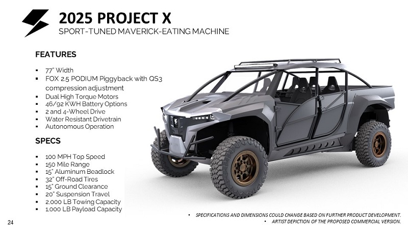 2025 PROJECT X FEATURES ▪ 77” Width ▪ FOX 2.5 PODIUM Piggyback with QS3 compression adjustment ▪ Dual High Torque Motors ▪ 46/92 KWH Battery Options ▪ 2 and 4 - Wheel Drive ▪ Water Resistant Drivetrain ▪ Autonomous Operation SPORT - TUNED MAVERICK - EATING MACHINE SPECS ▪ 100 MPH Top Speed ▪ 150 Mile Range ▪ 15” Aluminum Beadlock ▪ 32” Off - Road Tires ▪ 15” Ground Clearance ▪ 20” Suspension Travel ▪ 2,000 LB Towing Capacity ▪ 1,000 LB Payload Capacity 24 • SPECIFICATIONS AND DIMENSIONS COULD CHANGE BASED ON FURTHER PRODUCT DEVELOPMENT. • ARTIST DEPICTION OF THE PROPOSED COMMERCIAL VERSION.
