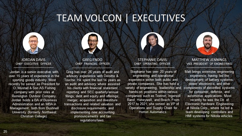 25 TEAM VOLCON | EXECUTIVES 25 JORDAN DAVIS CHIEF EXECUTIVE OFFICER Jordan is a senior executive with over 15 years of experience in the sporting goods industry. Most recently he served as President for O. Mustad & Son AS Fishing company with prior roles at Remington Outdoor Company. Jordan holds a BA of Business Administration and an MBA in Management, both from Bushnell University (formerly Northwest Christian College). GREG ENDO CHIEF FINANCIAL OFFICER Greg has over 26 years of audit and advisory experience with Deloitte & Touche . He spent the last 14 years as an audit and advisory where assisted his clients with financial statement reporting and SEC quarterly/annual filings; debt and equity and offerings; merger, acquisition and divestiture transactions and related valuation and disclosure requirements; and implementing new accounting pronouncements and tax regulations/laws. STEPHANIE DAVIS CHIEF OPERATING OFFICER Stephanie has over 20 years of engineering and operational experience within both public and private companies. She has held a variety of engineering, leadership and hands - on positions within various companies such as Textron, Ingersoll Rand, Honeywell, and Bosch. From 2017 to 2021, she served as VP of Operations and Supply Chain for Horton Automatics. Matt brings extensive engineering experience, having led the development of battery systems, power electronics, and other components of electrified systems for consumer, defense, and automotive applications. Most recently he was the Dir. of Electronic Hardware Engineering at Nikola Corp., where he led a team developing controllers and HMI systems for Nikola vehicles. MATTHEW JENNINGS VICE PRESIDENT OF ENGINEERING