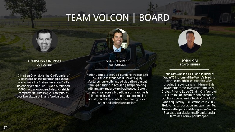 27 27 TEAM VOLCON | BOARD CHRISTIAN OKONSKY CO - FOUNDER Christian Okonsky is the Co - Founder of Volcon and an industrial engineer and was on one the first engineers in Dell’s notebook division. Mr. Okonsky founded AYRO Inc., a low - speed electric vehicle company. Mr. Okonsky currently holds over two - dozen U.S. and foreign patents. ADRIAN JAMES CO - FOUNDER Adrian James is the Co - Founder of Volcon and he is also the founder of Sprout Equity Ventures, an Austin based global investment firm specializing in acquiring and partnering with mature and growing businesses. Sprout currently manages a broad base of investments in the electric vehicle, space tourism, mining, biotech, med device, alternative energy, clean water and technology sectors. JOHN KIM BOARD MEMBER John Kim was the CEO and founder of Super73 Inc, one of the World’s leading electric motorbike companies. After growing the company, Mr. Kim sold his ownership to the investment firm Tiger Global. Prior to Super73, Mr. Kim founded U - Life Inc, an internet enabled home appliance company in South Korea. U - life was acquired by LG Electronics in 2003. Before his career as an entrepreneur, Mr. Kim was the principal designer for Yahoo Search, a car designer at Honda, and a former US Army paratrooper.