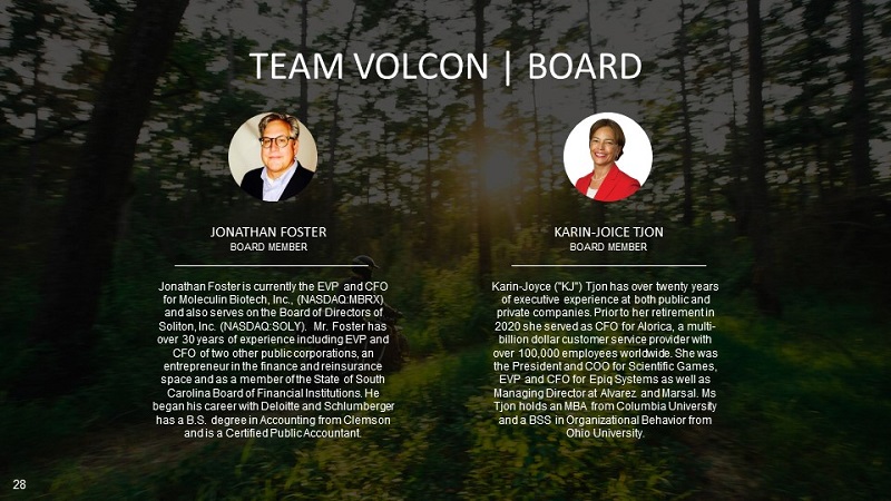 28 28 TEAM VOLCON | BOARD KARIN - JOICE TJON BOARD MEMBER Karin - Joyce ("KJ") Tjon has over twenty years of executive experience at both public and private companies. Prior to her retirement in 2020 she served as CFO for Alorica, a multi - billion dollar customer service provider with over 100,000 employees worldwide. She was the President and COO for Scientific Games, EVP and CFO for Epiq Systems as well as Managing Director at Alvarez and Marsal. Ms Tjon holds an MBA from Columbia University and a BSS in Organizational Behavior from Ohio University. JONATHAN FOSTER BOARD MEMBER Jonathan Foster is currently the EVP and CFO for Moleculin Biotech, Inc., (NASDAQ:MBRX) and also serves on the Board of Directors of Soliton, Inc. (NASDAQ:SOLY). Mr. Foster has over 30 years of experience including EVP and CFO of two other public corporations, an entrepreneur in the finance and reinsurance space and as a member of the State of South Carolina Board of Financial Institutions. He began his career with Deloitte and Schlumberger has a B.S. degree in Accounting from Clemson and is a Certified Public Accountant.