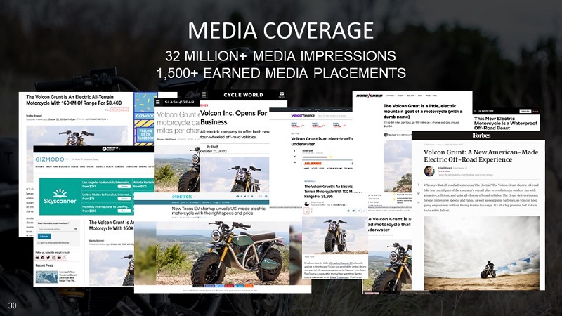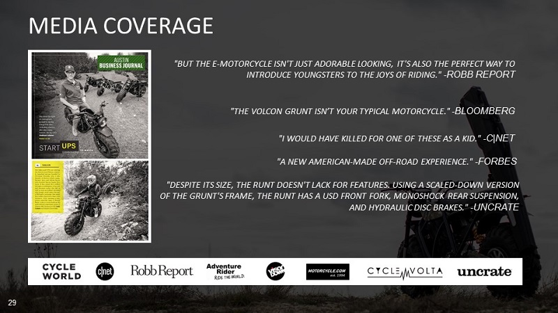 "BUT THE E - MOTORCYCLE ISN'T JUST ADORABLE LOOKING, IT'S ALSO THE PERFECT WAY TO INTRODUCE YOUNGSTERS TO THE JOYS OF RIDING." - ROBB REPORT "I WOULD HAVE KILLED FOR ONE OF THESE AS A KID." - C|NET "A NEW AMERICAN - MADE OFF - ROAD EXPERIENCE." - FORBES "DESPITE ITS SIZE, THE RUNT DOESN'T LACK FOR FEATURES. USING A SCALED - DOWN VERSION OF THE GRUNT'S FRAME, THE RUNT HAS A USD FRONT FORK, MONOSHOCK REAR SUSPENSION, AND HYDRAULIC DISC BRAKES." - UNCRATE 29 MEDIA COVERAGE "THE VOLCON GRUNT ISN’T YOUR TYPICAL MOTORCYCLE." - BLOOMBERG