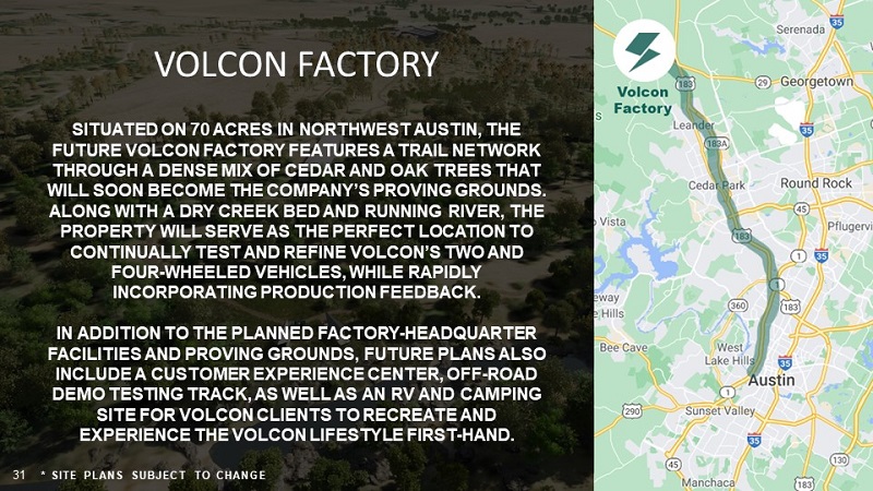 VOLCON FACTORY SITUATED ON 70 ACRES IN NORTHWEST AUSTIN, THE FUTURE VOLCON FACTORY FEATURES A TRAIL NETWORK THROUGH A DENSE MIX OF CEDAR AND OAK TREES THAT WILL SOON BECOME THE COMPANY’S PROVING GROUNDS. ALONG WITH A DRY CREEK BED AND RUNNING RIVER, THE PROPERTY WILL SERVE AS THE PERFECT LOCATION TO CONTINUALLY TEST AND REFINE VOLCON’S TWO AND FOUR - WHEELED VEHICLES, WHILE RAPIDLY INCORPORATING PRODUCTION FEEDBACK. IN ADDITION TO THE PLANNED FACTORY - HEADQUARTER FACILITIES AND PROVING GROUNDS, FUTURE PLANS ALSO INCLUDE A CUSTOMER EXPERIENCE CENTER, OFF - ROAD DEMO TESTING TRACK, AS WELL AS AN RV AND CAMPING SITE FOR VOLCON CLIENTS TO RECREATE AND EXPERIENCE THE VOLCON LIFESTYLE FIRST - HAND. 31 * SITE PLANS SUBJECT TO CHANGE