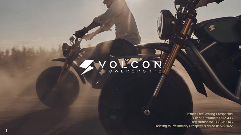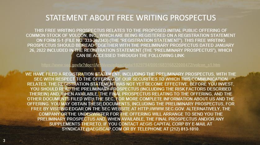 STATEMENT ABOUT FREE WRITING PROSPECTUS THIS FREE WRITING PROSPECTUS RELATES TO THE PROPOSED INITIAL PUBLIC OFFERING OF COMMON STOCK OF VOLCON, INC., WHICH ARE BEING REGISTERED ON A REGISTRATION STATEMENT ON FORM S - 1 (FILE NO. 333 - 262343) (THE “REGISTRATION STATEMENT”). THIS FREE WRITING PROSPECTUS SHOULD BE READ TOGETHER WITH THE PRELIMINARY PROSPECTUS DATED JANUARY 26, 2022 INCLUDED IN THE REGISTRATION STATEMENT (THE “PRELIMINARY PROSPECTUS”), WHICH CAN BE ACCESSED THROUGH THE FOLLOWING LINK: HTTPS://WWW.SEC.GOV/ARCHIVES/EDGAR/DATA/1829794/000168316821004236/VOLCON_S1.HTM WE HAVE FILED A REGISTRATION STATEMENT, INCLUDING THE PRELIMINARY PROSPECTUS, WITH THE SEC WITH RESPECT TO THE OFFERING OF OUR SECURITIES TO WHICH THIS COMMUNICATION RELATES. THE REGISTRATION STATEMENT HAS NOT YET BECOME EFFECTIVE. BEFORE YOU INVEST, YOU SHOULD READ THE PRELIMINARY PROSPECTUS (INCLUDING THE RISK FACTORS DESCRIBED THEREIN) AND, WHEN AVAILABLE, THE FINAL PROSPECTUS RELATING TO THE OFFERING, AND THE OTHER DOCUMENTS FILED WITH THE SEC, FOR MORE COMPLETE INFORMATION ABOUT US AND THE OFFERING. YOU MAY OBTAIN THESE DOCUMENTS, INCLUDING THE PRELIMINARY PROSPECTUS, FOR FREE BY VISITING EDGAR ON THE SEC WEBSITE AT HTTP://WWW.SEC.GOV. ALTERNATIVELY, THE COMPANY OR THE UNDERWRITER FOR THE OFFERING WILL ARRANGE TO SEND YOU THE PRELIMINARY PROSPECTUS AND, WHEN AVAILABLE, THE FINAL PROSPECTUS AND/OR ANY SUPPLEMENTS THERETO, IF YOU CONTACT AEGIS CAPITAL CORP BY E - MAIL AT SYNDICATE@AEGISCAP.COM OR BY TELEPHONE AT (212) 813 - 1010. 3