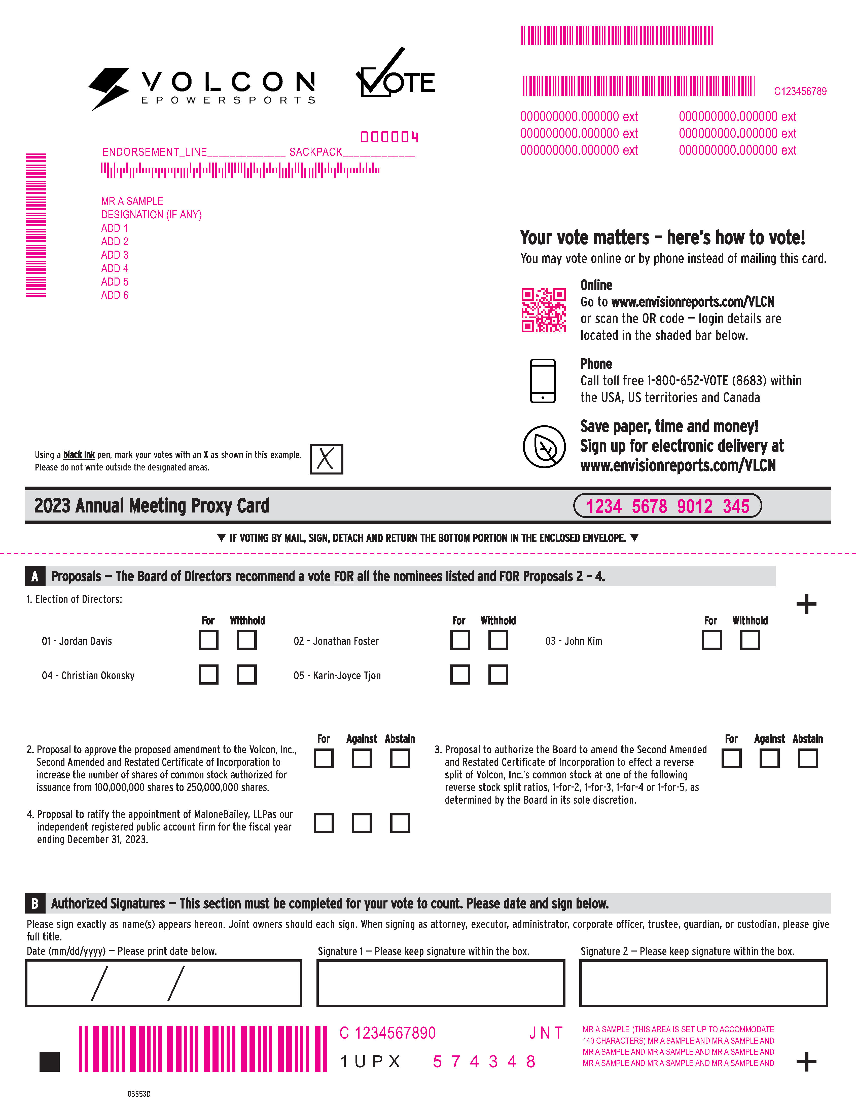 01 - Jordan Davis 04 - Christian Okonsky 02 - Jonathan Foster 05 - Karin - Joyce Tjon 03 - John Kim For Withhold For Withhold For Withhold 1 U P X Using a black ink pen, mark your votes with an X as shown in this example. Please do not write outside the designated areas. 03S53D + + Proposals — The Board of Directors recommend a vote FOR all the nominees listed and FOR Proposals 2 – 4. A 2. Proposal to approve the proposed amendment to the Volcon, Inc., Second Amended and Restated Certificate of Incorporation to increase the number of shares of common stock authorized for issuance from 100,000,000 shares to 250,000,000 shares. 3. Proposal to authorize the Board to amend the Second Amended and Restated Certificate of Incorporation to effect a reverse split of Volcon, Inc.’s common stock at one of the following reverse stock split ratios, 1 - for - 2, 1 - for - 3, 1 - for - 4 or 1 - for - 5, as determined by the Board in its sole discretion. 1. Election of Directors: For Against Abstain Please sign exactly as name(s) appears hereon. Joint owners should each sign. When signing as attorney, executor, administrator, corporate officer, trustee, guardian, or custodian, please give full title. Date (mm/dd/yyyy) — Please print date below. Signature 1 — Please keep signature within the box. Signature 2 — Please keep signature within the box. Authorized Signatures — This section must be completed for your vote to count. Please date and sign below. B T IF VOTING BY MAIL, SIGN, DETACH AND RETURN THE BOTTOM PORTION IN THE ENCLOSED ENVELOPE. T 2023 Annual Meeting Proxy Card 1234 5678 9012 345 For Against Abstain 4 . Proposal to ratify the appointment of MaloneBailey, LLPas our independent registered public account firm for the fiscal year ending December 31 , 2023 . 000004 ENDORSEMENT_LINE SACKPACK MR A SAMPLE DESIGNATION (IF ANY) ADD 1 ADD 2 ADD 3 ADD 4 ADD 5 ADD 6 MMMMMMMMM MMMMMMMMMMMM MMMMMMMMMMMMMM 5 7 4 3 4 8 MR A SAMPLE (THIS AREA IS SET UP TO ACCOMMODATE 140 CHARACTERS) MR A SAMPLE AND MR A SAMPLE AND MR A SAMPLE AND MR A SAMPLE AND MR A SAMPLE AND MR A SAMPLE AND MR A SAMPLE AND MR A SAMPLE AND C 1234567890 J N T C123456789 MMMMMM 000000000.000000 ext 000000000.000000 ext 000000000.000000 ext 000000000.000000 ext 000000000.000000 ext 000000000.000000 ext If no electronic voting, delete QR code and control # Δ ≈ Your vote matters – here’s how to vote! You may vote online or by phone instead of mailing this card. Online Go to www.envisionreports.com/VLCN or scan the QR code — login details are located in the shaded bar below. Phone Call toll free 1 - 800 - 652 - VOTE (8683) within the USA, US territories and Canada Save paper, time and money! Sign up for electronic delivery at www.envisionreports.com/VLCN