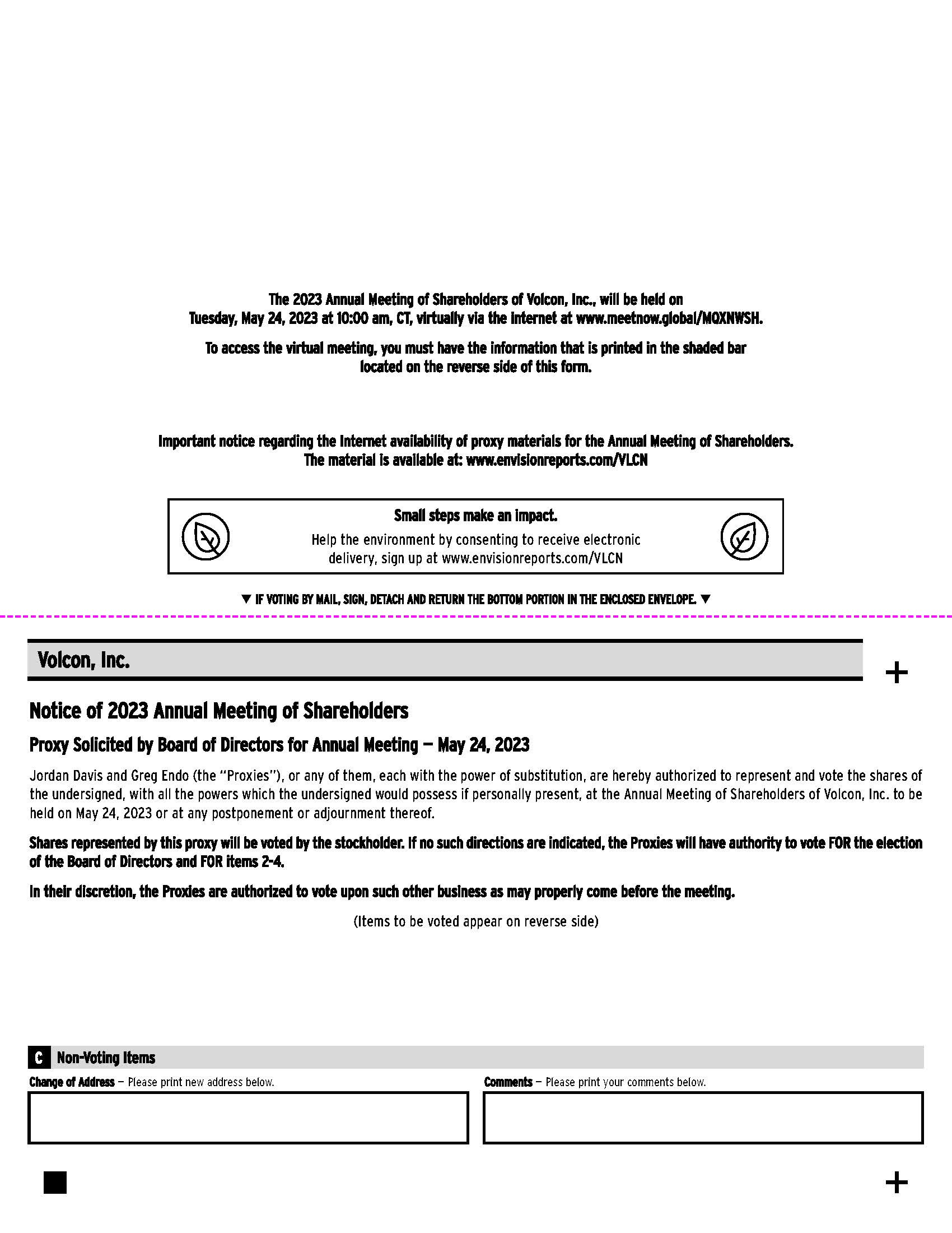 Important Notice Regarding the Availability of Proxy Materials for the Annual Meeting to Be Held on Wednesday, May 24, 2023. The Proxy Statement, form of Proxy, and our 2022 Annual Report on Form 10-K for the year ended December 31, 2022, are available on the Internet at www.envisionreports.com/VLCN and on our corporate website at www.volcon.com under “Investors—SEC Filings.”